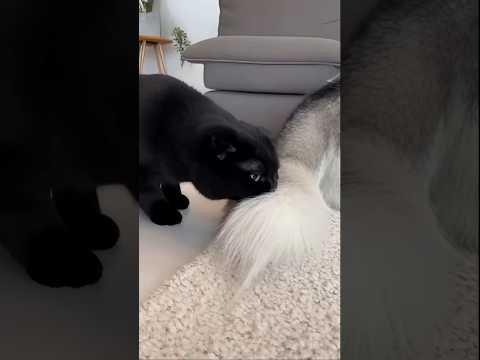 Dog Catches Cat March 20, 2026 Cat unable to control its obsession with tail, gets hold of dog's tail, bites it and runs away. Dog, born as detective finds the cat hiding behind the curtain.