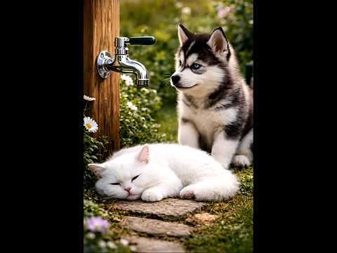 Husky puppy's clever mischief on kitten.